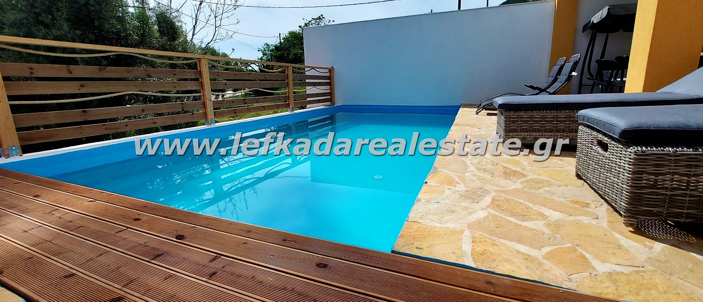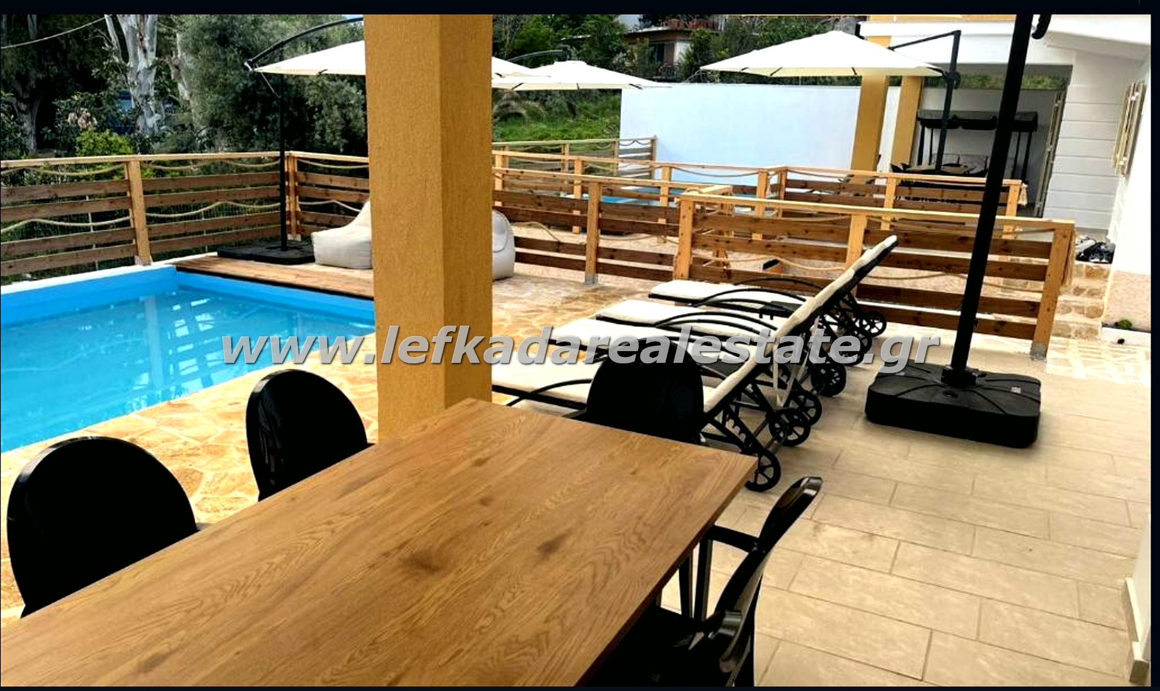 The outdoor area is fully fenced and beautifully landscaped, combining natural materials, while the private pool creates a pleasant and relaxing atmosphere.